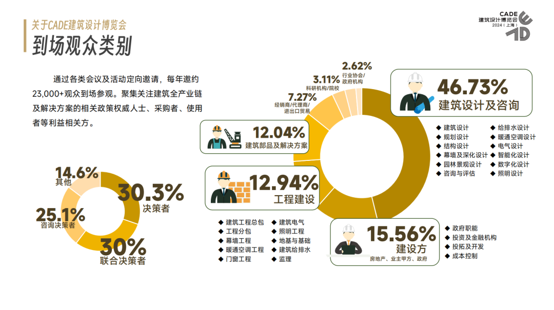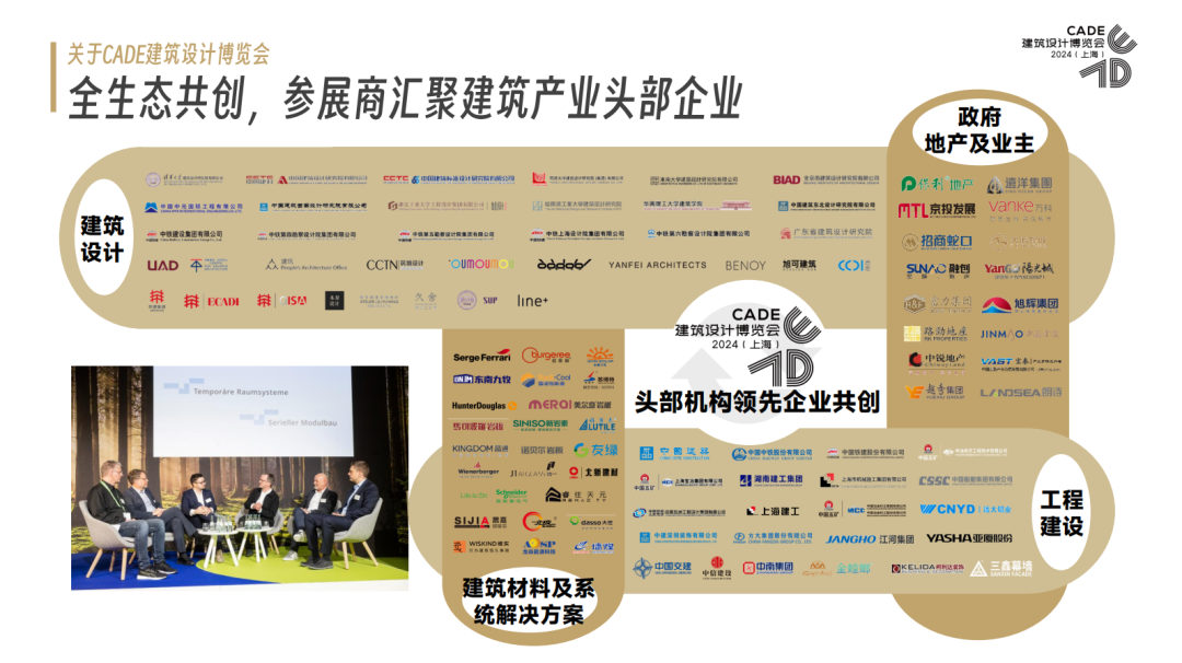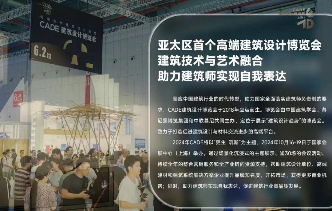 plplCADE 建筑设计博览会由中国建筑学会、慕尼黑博览集团和中联慕尼共同主办。致力于打造促进建筑设计与材料交流进步的高端平台。2024年CADE将以“更生 筑新”为主题,通过场景化沉浸式的主题展示和逾30场的会议活动,持续全年的整合营销服务和全产业链的资源支持,帮助建筑设计单位、高端建材和建筑系统解决方案企业提升品牌知名度,开拓市场,获得更多商业机遇,促进建筑行业高品质发展。?