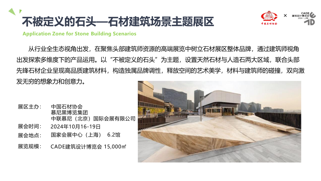 中国石材协会将与中联慕尼(北京)国际有限公司共同搭建石材设计交流平台,将于CADE 建筑设计博览会期间举办“不被定义的石头——石材建筑场景应用主题展”,2024 年 10月 16 日-19 日在国家会展中心(上海)开幕。