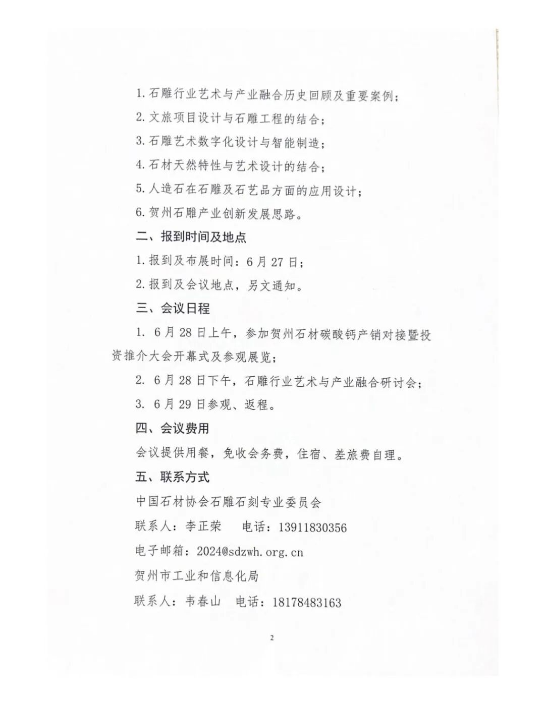 石雕石刻是中华民族优秀传统艺术的重要组成部分,传承至今已有两千多年历史。改革开放以来,石雕石刻产业得到快速发展,已形成福建惠安、河北曲阳、山东嘉祥、广东云浮等重要石雕石刻产业基地。广西贺州市拥有丰富的白色大理石资源,近年来十分重视石雕产业的发展。应贺州市人民政府邀请,中国石材协会石雕专委会将在2024年6月举办的“2024中国贺州石材碳酸钙产销对接暨投资推介大会”期间开展“中国石雕石刻大师贺州行”活动,包括举办艺术家、大师作品展,召开“石雕行业艺术与产业融合研讨会”。邀请艺术院校知名教授,石雕产区工艺大师、重点石雕产区行业主管领导、石雕产业相关企业家到贺州考察、研讨。1. 6月28日上午,参加贺州石材碳酸钙产销对接暨投资推介大会开幕式及参观展览;2. 6月28日下午,石雕行业艺术与产业融合研讨会;请各位参会代表于6月18日前将参会回执表发邮件至会务组,并于6月21日前告知会务组接站时间和地点。